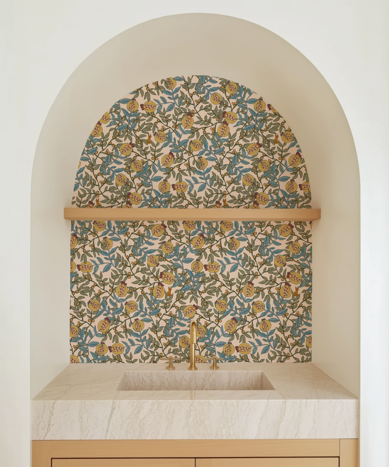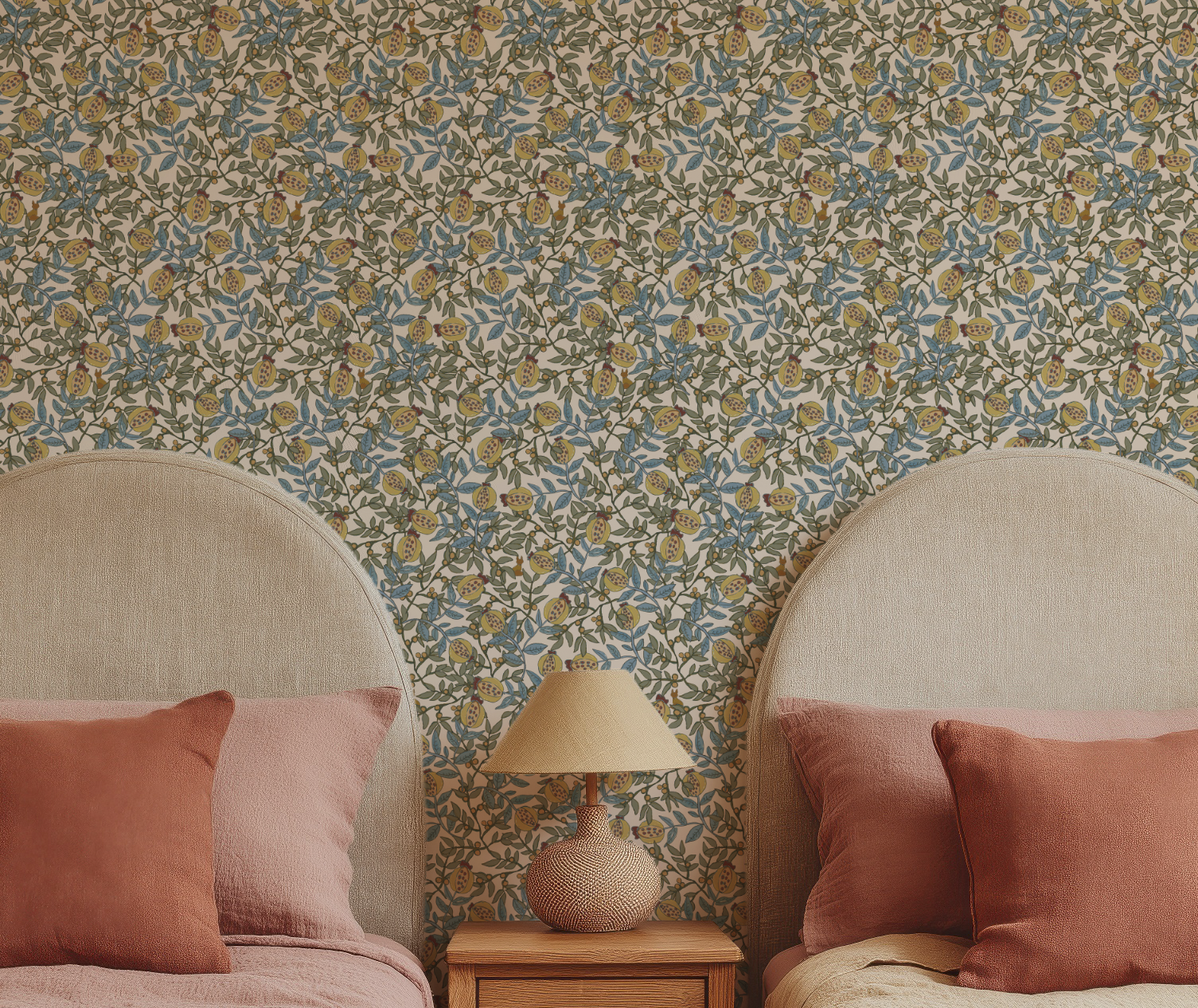 Orchard is inspired by my family's garden in California, where we pick pomegranates and loquats and sometimes spot lucky foxes at night! Hand-drawn fruits, leaves and foxes with a nod to William Morris. Printed on non-woven fibre to provide a more textured, luxe ground.