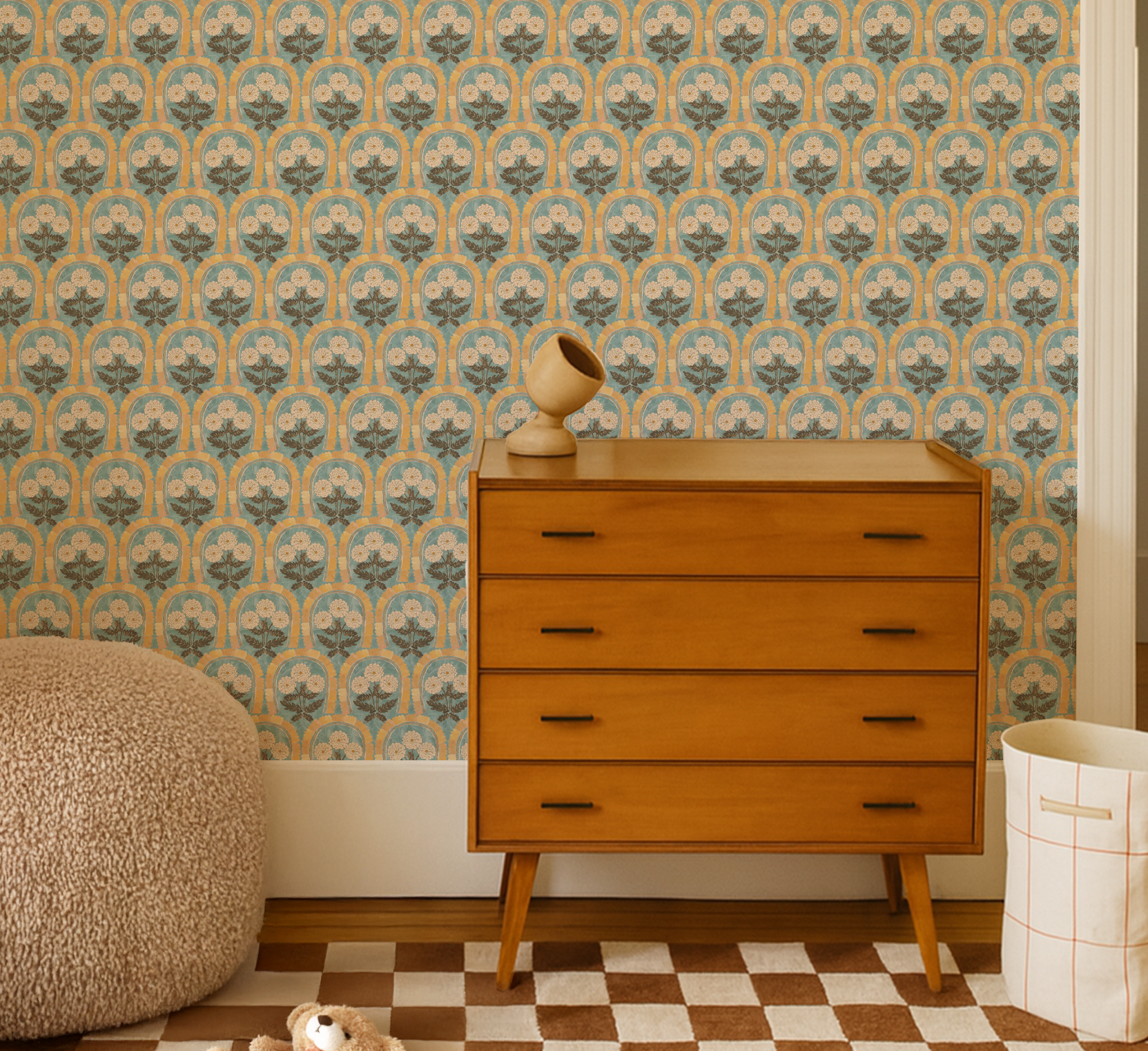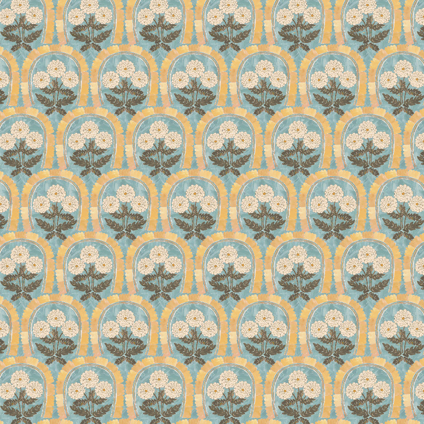 Hand drawn and painted marigold flowers with a sweet scalloped arch. Inspired by my family's garden on the Central Coast of California. Makes a lovely painterly scallop pattern with lots of charming details.